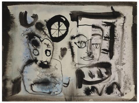 rgba(255,255,255,1) Norris EmbrySans titre (Deux visages et roue), vers 1968-72Signé de l'initiale 'N' (en bas à droite) encre et aquarelle sur papier 22.5 x 30 cm.