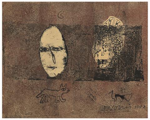 rgba(255,255,255,1) Norris EmbrySans titre (Deux visages et un chien), 1962Signé et daté 'Norris 1962' (en bas à droite) Monotype sur papier 21 x 27 cm.