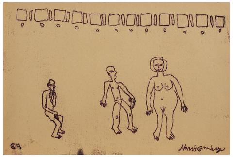 rgba(255,255,255,1) Norris EmbrySans titre (Femme nue debout et deux hommes), 1963Signé 'Norris Embry' (en bas à droite), daté '63' (en bas à gauche) monotype sur papier 30.5 x 45.8 cm.