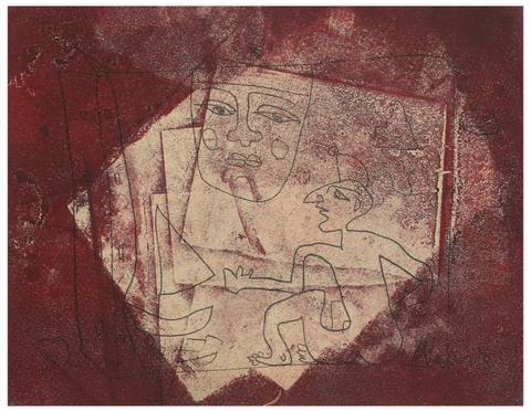 rgba(255,255,255,1) Norris EmbrySans titre (Homme assis et masque), 1962Signé 'Norris' (en bas à droite), daté '62' (en bas à gauche) Monotype sur papier 21.5 x 27.7 cm.