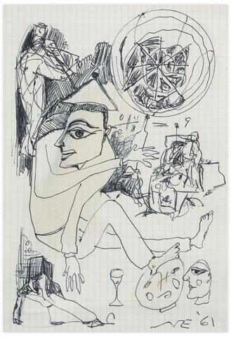 rgba(255,255,255,1) Norris EmbrySans titre (Homme assis, visage, figure et verre), 1961Signé et daté 'NE 61' (en bas à droite) Stylo à bille sur papier 20.5 x 14.5 cm.