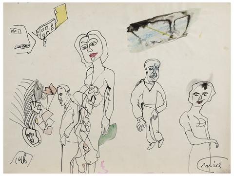 rgba(255,255,255,1) Norris EmbrySans titre (Quatre figures), 1968Signé 'Norris' (en bas à droite), daté '1968' (en bas à gauche) encre, aquarelle et pastel gras sur papier 45.5 x 60.5 cm.
