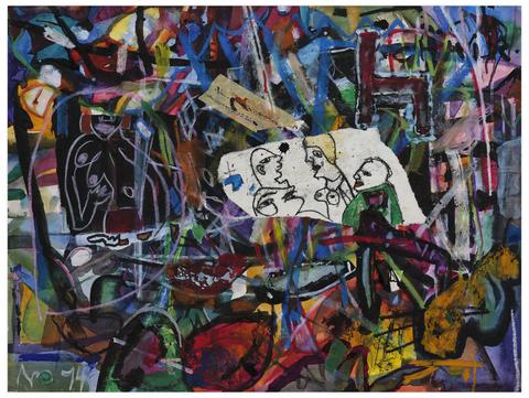 rgba(255,255,255,1) Norris EmbrySans titre (Quatre figures de profil), 1974Signé et daté 'NO 74' (en bas à droite) gouache, aquarelle, crayon gras, encre, monotype et collage sur papier 45.5 x 60.5 cm. Inscriptions: 'CHAIR' / et avec le cachet de succession 'NORRIS EMBRY ESTATE' (au revers)
