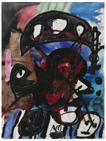rgba(255,255,255,1) Norris EmbrySans titre (Trois cercles blanc, recto); Figure de profil à droite (verso), 1978Signé 'NO' (en bas au centre), daté '78' (en bas à droite) aquarelle et crayon gras sur papier 60.5 x 46 cm.