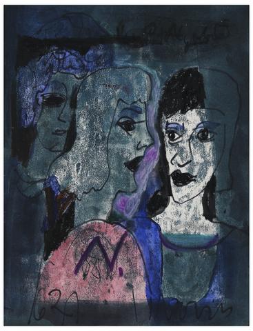 rgba(255,255,255,1) Norris EmbrySans titre (Trois femmes), 1962Signé et daté '1962 Norris' (en bas) monotype, aquarelle, feutre et crayon gras sur papier 27.2 x 20.8 cm.