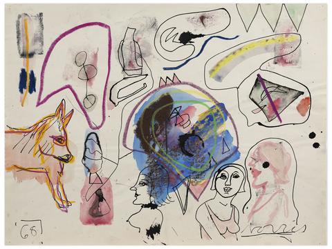 rgba(255,255,255,1) Norris EmbrySans titre (Trois femmes et chien de profil), 1968Signé 'Norris' (en bas à droite), daté '68' (en bas à gauche) encre, aquarelle et pastel gras sur papier 45.5 x 60.5 cm.