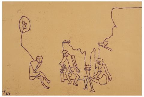 rgba(255,255,255,1) Norris EmbrySans titre (Trois figures assises), 1963Daté '63' (en bas à gauche) Monotype sur papier 30.5 x 44.4 cm.