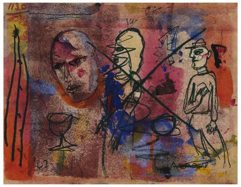 rgba(255,255,255,1) Norris EmbrySans titre (Trois figures et verre), 1962Signé 'Norris' (en bas à droite), daté '62' (en bas à gauche) aquarelle, encre et pastel gras sur papier chamois 21.5 x 27.7 cm.