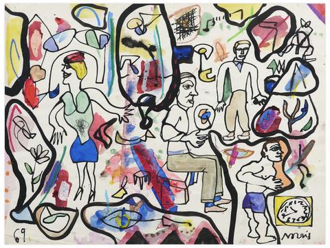 rgba(255,255,255,1) Norris EmbrySans titre (Trois hommes, une femme en jupe bleue), 1969Signé 'Norris' (en bas à droite), daté '69' (en bas à gauche) Encre, aquarelle, crayon gras, stylo à bille sur papier 46 x 61 cm.
