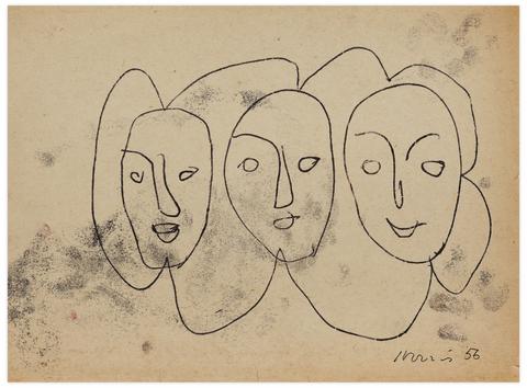 rgba(255,255,255,1) Norris EmbrySans titre (Trois masques), 1956Signé et daté 'Norris 56' (en bas à droite) monotype sur papier 20.9 x 29.6 cm.