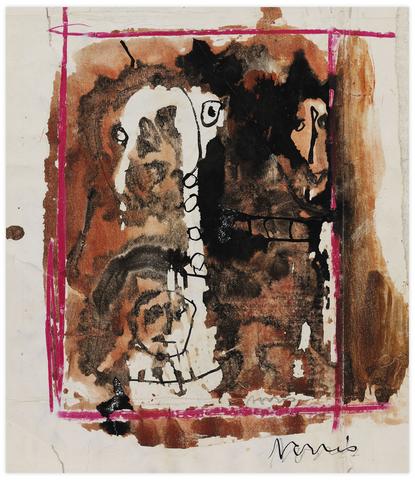 rgba(255,255,255,1) Norris EmbrySans titre (Trois masques), vers 1954-57Signé deux fois 'Norris' (en bas à droite) encre, gouache et crayon gras sur papier glacé 25 x 22 cm.