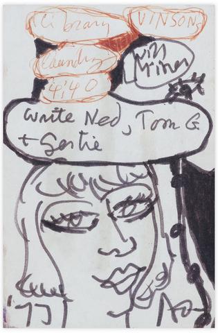 rgba(255,255,255,1) Norris EmbrySans titre (Write Ned, Tom + Gertie), 1977Signé 'NO' (en bas à droite), daté '77' (en bas à gauche) feutre et stylo à bille sur papier 14.5 x 9.7 cm.
