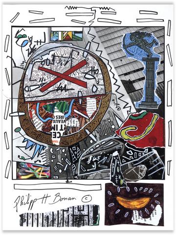 rgba(255,255,255,1) Philipp Hugues BonanSans titre (banane et croix)Collage et peinture sur photo en hommage à Robert Combas, 40 x 30 cm. Demande d'information