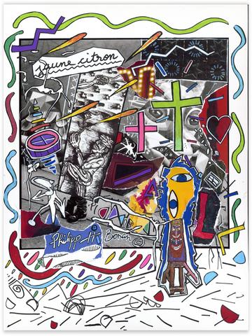 rgba(255,255,255,1) Philipp Hugues BonanSans titre (jaune citron)Collage et peinture sur photo en hommage à Robert Combas, 40 x 30 cm. Demande d'information