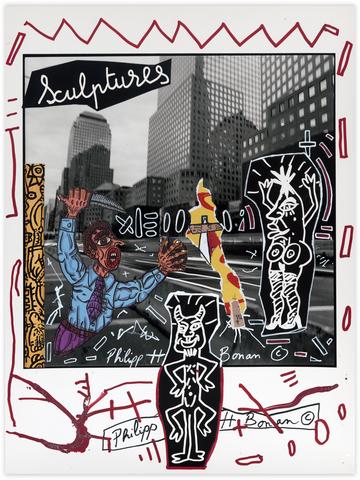 rgba(255,255,255,1) Philipp Hugues BonanSans titre (sculptures)Collage et peinture sur photo en hommage à Robert Combas, 40 x 30 cm. Demande d'information