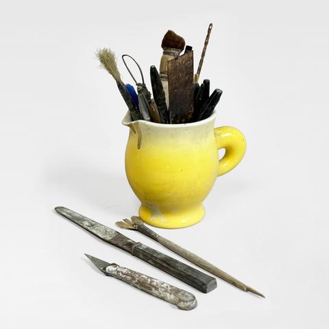 Faïence, émail jaune brillant dégradé blanc. Les outils du sculpteur-céramiste.