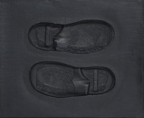 rgba(255,255,255,1) Roy AdzakChaussures d'enfantPeinture et empreinte sur toile signée et datée au dos, 27 × 21,5 cm, 1966.
