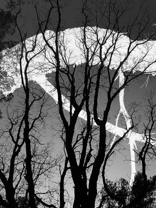 Je m’attarde sur ces photographies d’arbres, elles m’interrogent sur ce croisement entre le négatif et le positif, je reviens dessus, sur cette pensée, comment ma vision se fait et se défait dans ce travail plastique ? Que dire de ce double moment ? si ce n’est cette réflexion de l’artiste « l’espace négatif ne correspond pas au positif, c’est souvent un espace voisin, complice, lesquels génèrent leur enlacement en postproduction. »