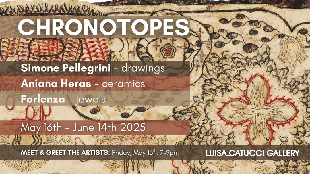Chronotopes brings together the work of Simone Pellegrini, Aniana Heras, and the Forlenza jewellery atelier in a setting that blurs the line between contemporary art exhibition and archaeological museum. The display evokes vitrines, relics, and ceremonial stillness, yet what we encounter are not remnants of a known past, but objects from speculative time-spaces—chronotopes in the Bakhtinian sense: narrative zones where time and space coalesce into mythic and imaginative forms.