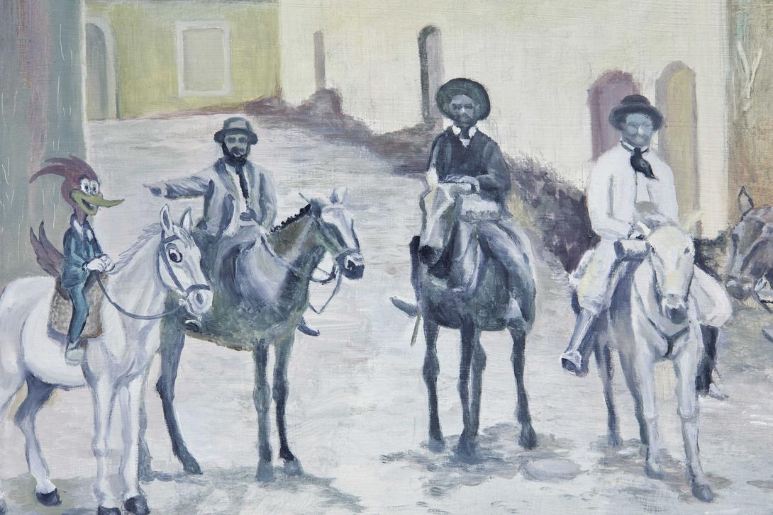 At the center of these scenes emerges Woody Woodpecker (Pica-Pau), a figure the artist encountered during a four-hour wait for a train in Nova Era (MG). “I befriended a boy, the grandson of a railway worker, who lived between the Doce River and the tracks. He said he only knew how to draw Woody Woodpecker, and we swapped drawings,” Malagodi recalls.