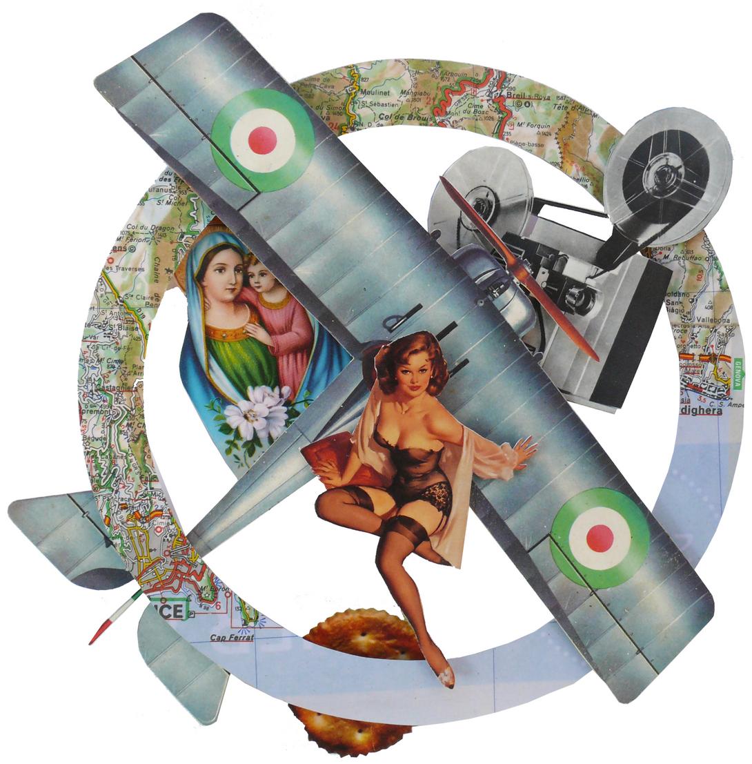 Bien souvent j’utilise des images frappantes chargées de symboles inhérents à notre société. Ces éléments fortement chargés en représentation sont présents pour renforcer le propos du collage.