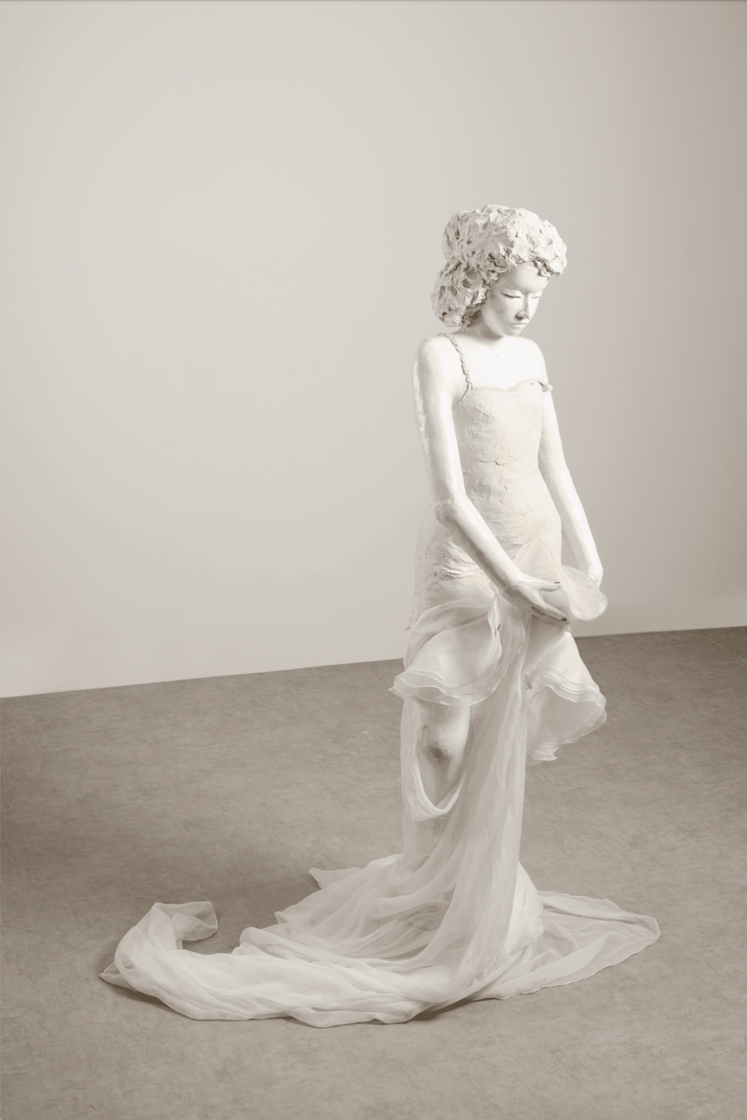 À l’étage, le parcours se fait plus introspectif : une jeune fille en robe de mariée – fragment emprunté à l’univers de Jacques Demy et à son Peau d’Âne – incarne l’éveil à la conscience du corps, du regard et du désir. Entre déchirure, métamorphose et apparition d’une figure d’Arlequin, l’exposition interroge les récits qui façonnent l’imaginaire féminin, du conte au mythe du « plus beau jour de la vie ».