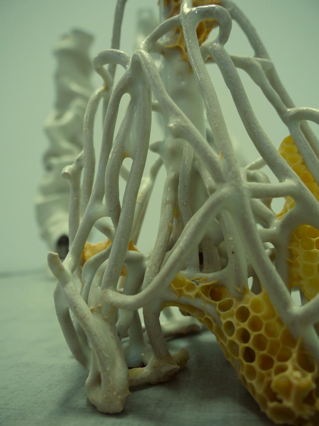 Certaines des céramiques de petit format qui composent ce paysage sonore et visuel ont été placées dans des ruches d’abeilles. Les insectes ont bâti leur rayon de cire jaune entre les rhizomes complexes de ces pièces en terre cuite.