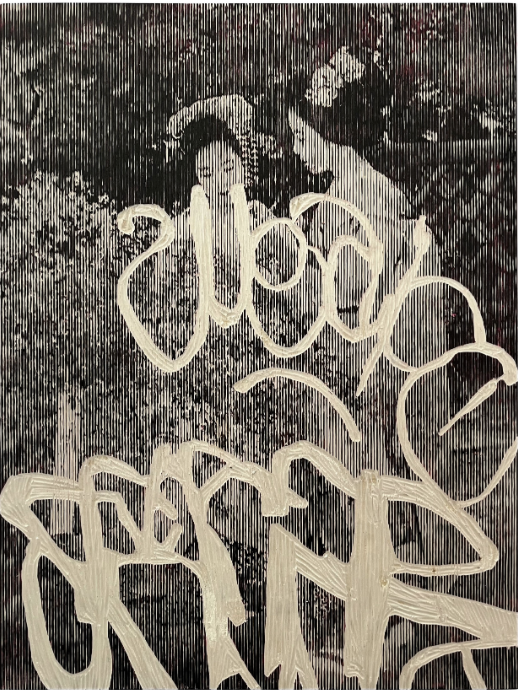 Pour cette exposition à la galerie Prima, l’artiste propose une nouvelle série de gravures pensées comme des collisions : celles de figures féminines japonaises représentées dans des intérieurs calmes, presque figés, et de tags extraits des rues de Paris. Chaque œuvre fonctionne comme une friction entre deux mondes – celui du fantasme orientaliste, hérité d’une histoire coloniale tenace, et celui d’une parole urbaine souvent masculine, codée, brutale.