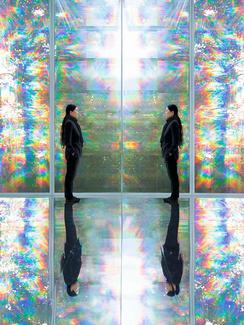 Ainsi, l’installation To Breathe / Mirror Woman est présentée dans le Forum. Les larges surfaces vitrées, qui permettent un jeu de transparence entre intérieur et extérieur, sont couvertes de filtres qui diffractent la lumière naturelle en un spectre chatoyant.