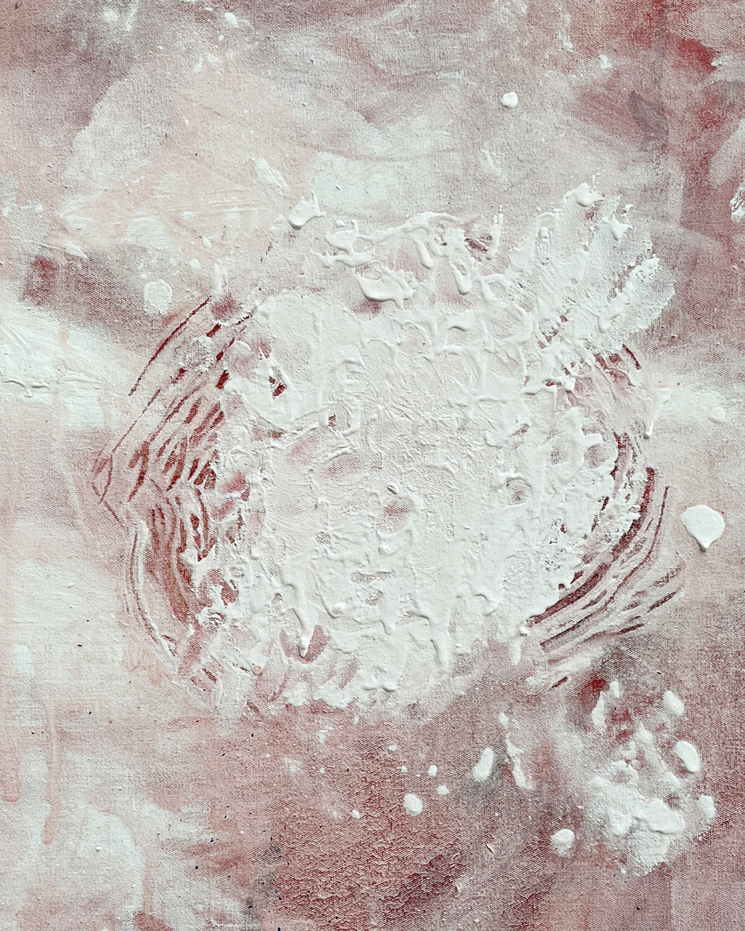 La seconde, plus grande, est un dialogue entre l’espace réel et l’espace virtuel, ponctuant l’espace d’exposition par ses variations de couleurs dûes à l’espace et au temps dans laquelle elle se trouve. Je parie sur l’interaction du spectateur•ice qui pourrait la prendre en photo avec le flash activé de son téléphone : une autre image de la peinture apparait en réaction sur son écran. La trace rencontre le numérique et l’empreinte résiste à son absorption par le digital engendré par la superpuissance technologique.
