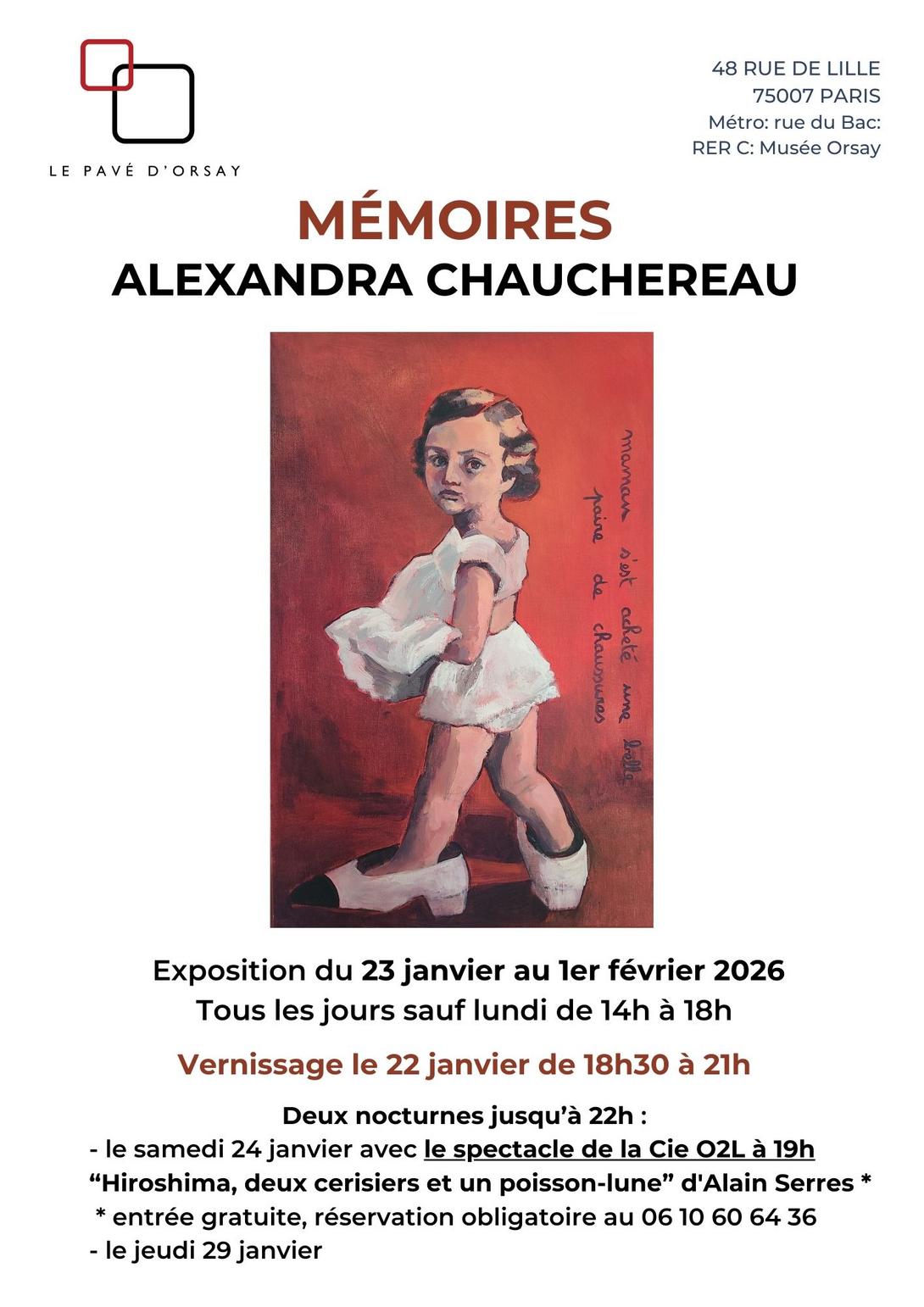 Le Pavé d’Orsay accueille l'artiste peintre Alexandra Chauchereau du 22 janvier au 1er Février 2026 avec ses toutes dernières œuvres, pour une exploration de la thématique des mémoires et de l’archive. En plongeant dans les archives, Alexandra Chauchereau, cherche à raviver et à magnifier la mémoire d'une époque et de celles et ceux qui y sont inscrits. Chaque document (photographique, écrit), chaque trace, devient le point de départ d’une enquête sensible, nourrie de souvenirs et d’imaginaire. Ses créations sont des récits, pour cette exposition ils portent principalement sur le monde de l’enfance. Individuelles et souvent partagées, ces mémoires tressent un lien invisible qui nous unit dans notre humanité.
