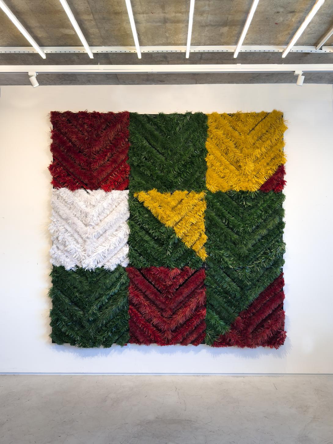 At the center of the room, a vertical sculpture made from spools of LED lights articulates value and luminosity by arranging them from the cheapest to the most luxurious. On the floor, sheets of wrapping paper are stacked to form a cube; the sheets, printed with photographs of every Christmas tree exhibited at Celebra Show, can be taken by visitors, reinserting these images into the same circulation system that produced them.