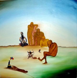 In this painting I tried to show the Cause of migration of people or Self-imposed exile . The four people that have a disappeared face are the most Major world powers of the nation and the king is a sign of a Puppet government which for them the peoples life doesn't matter and they don't evaluate peoples life. They are all watching people fighting and they are like the watchers of a football match and don't care for their lives and what is happening in their lives. And the woman which is going with a suitcase and colourful balloons is a sign of her sweet wishes and with the thoughts and hopes she has she is leaving her country. I used a shadow the opposite way of her to show that even though she is leaving her roots and family are in her country for always
