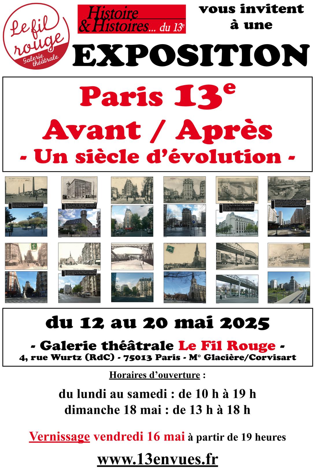 Du 12 au 20 mai 2025, je vous invite à mon exposition intitulée "Paris 13e avant / après - Un siècle d'évolution" qui se tiendra à la galerie théâtrale Le Fil Rouge du 4 rue Wurtz (75013)