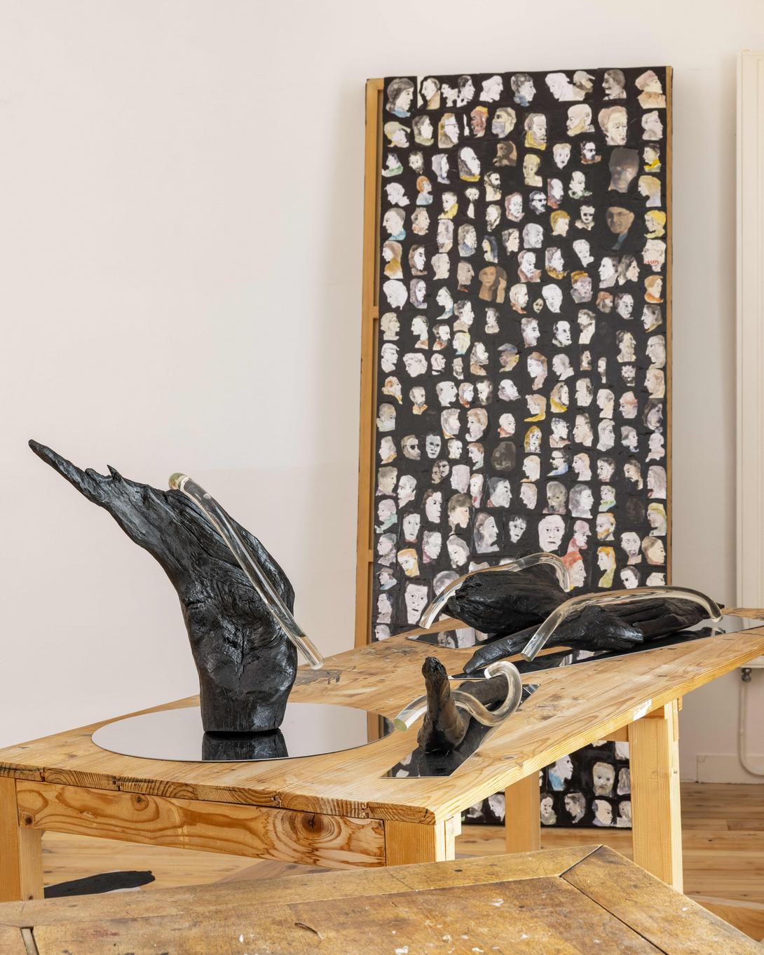 Cette nouvelle exposition s’ouvre de plain-pied avec Sculptures. La découpe de l’espace en deux par une haute et large pièce suspendue de cuir, noire et/ou miroitante donne le tempo. À l’entour de celle-ci, de part et d’autre les sculptures se partagent l’espace. Chacune d’elles inscrit un rapport de présence direct avec celui qui la regarde et peut s’y refléter. Ces dernières pièces tridimensionnelles associant métal, bois et verre questionnent physiquement la présence sensible et leurs effets mutuels de l’un sur l’autre. Elles mettent en scène un vide latent et porteur.