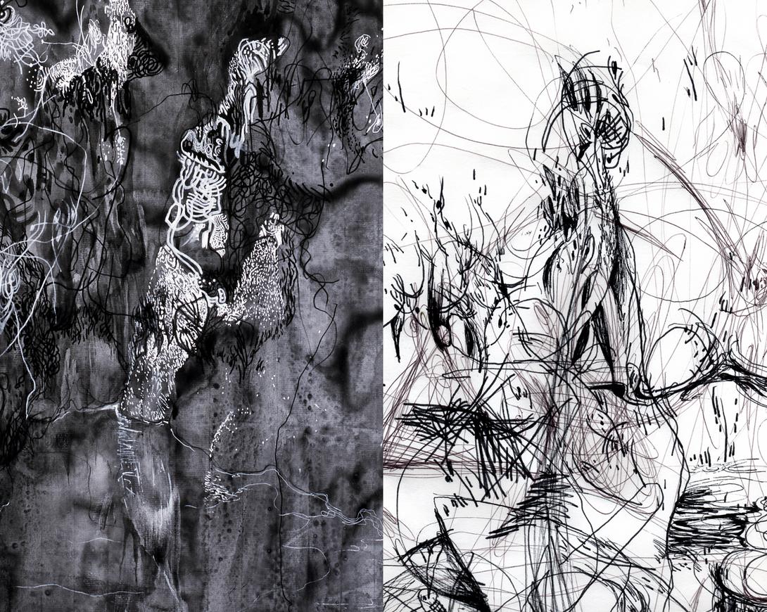 Le dessin danse nuptiale de moustique : bic, feutres et touch-pad de l'ordinateur portable. D'un médium l'autre. Les récents travaux sur papier visitent des contrées psychiques, entre lumière et ténèbres, ou l'organique et le sensoriel se font formes.