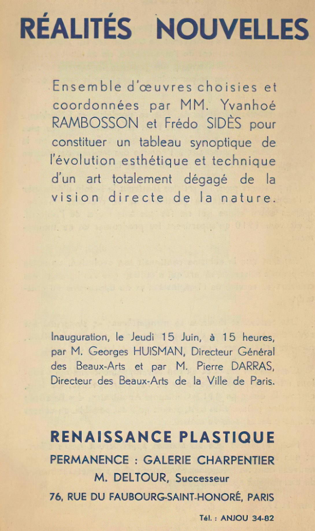 Le début de l'été voir le lancement Galerie Charpentier de l'exposition Réalités Nouvelles. On doit cette exposition à Fredo Sidés, le critique Yvanoé Rambosson qui réussissent à travers non pas une mais trois expositions à réunir quelques 72 artistes qu'ils qualifient d'"inobjectifs".