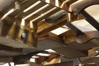 Tadashi Kawamata, Under The Water, 2011, Installation in situ. Eléments de mobilier en bois récupérés. Vue de l'exposition Under The Water, kamel mennour, Paris, 2011-2012, © Tadashi Kawamata. Photo Fabrice Seixas, Courtesy de l'artiste et kamel mennour, Paris