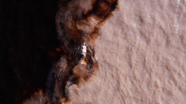 Emilija Škarnulytė’s work tells stories about how humans adapt to socio-environmental crises. Her art highlights landscapes that are not immediately visible. In Æqualia, the artist embodies a mermaid who swims at the confluence of the Rio Negro and the Amazon River. Pink dolphins approach and accompany her during the journey, alluding to mythological elements associated with mermaids and dolphins. These creatures are central to Amazonian cosmologies and are now threatened with extinction.