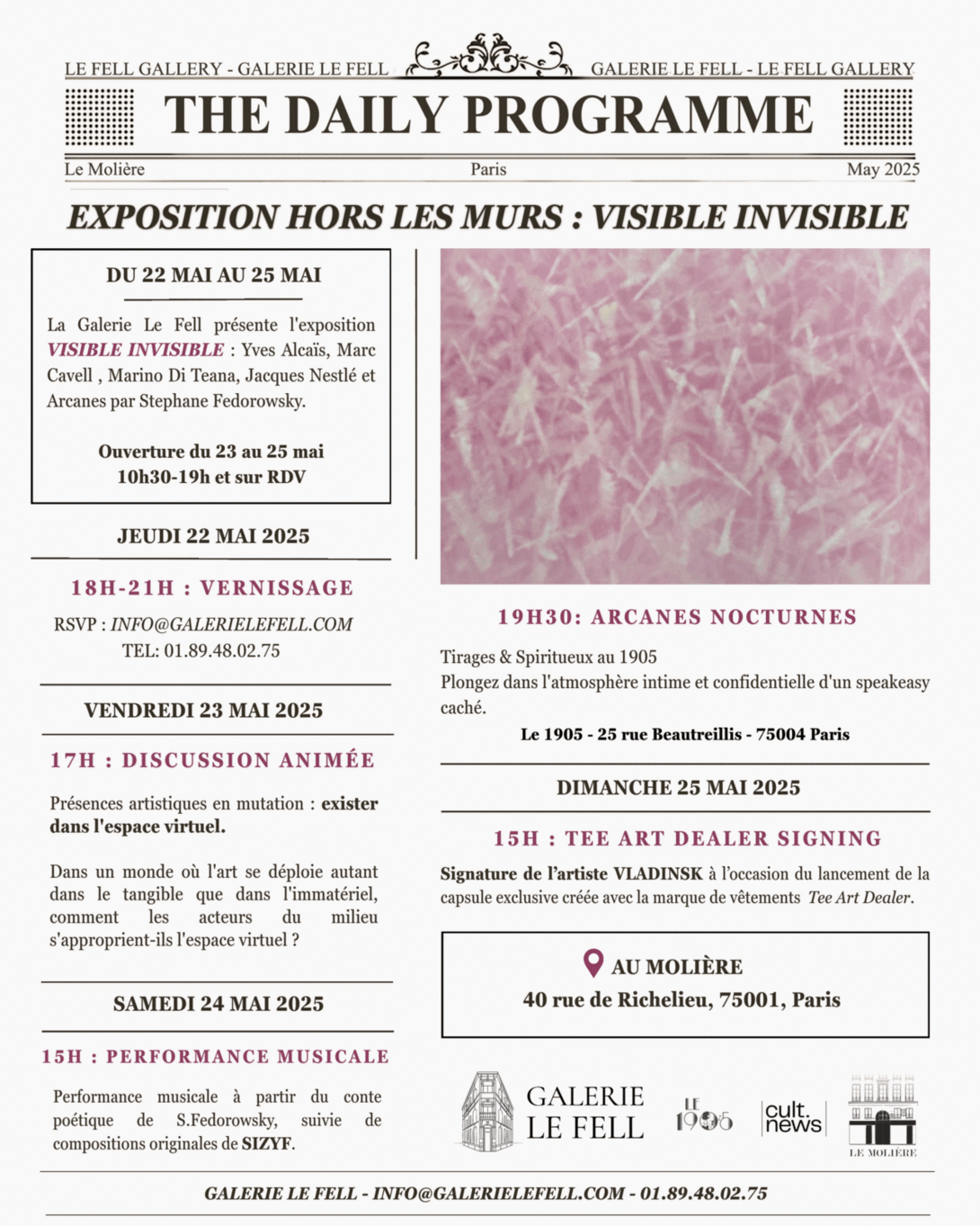 À l’occasion de sa relocalisation parisienne, la Galerie Le Fell s'établit au Molière, hôtel particulier emblématique de la rue de Richelieu et inaugure son nouveau cycle avec l'exposition VISIBLE INVISIBLE. Pendant trois jours, la perception oscille entre apparition et disparition, navigue entre perceptible et imperceptible, invitant le spectateur à une contemplation intuitive.